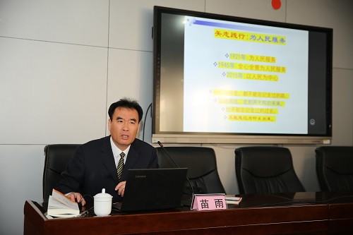 党课中,苗雨同志分别围绕“学史明理,明晰近代史理和重大历史关联性”、“学史增信,增强道路理论制度文化自信”、“学史崇德,崇尚以人民为中心的人类大德”和“学史力行,在建设现代化国家新征程中加快学校高质量发展步伐”四个方面详细阐述了为什么要学习百年史,怎样学习百年史,如何践悟新思想,怎样奋进新征程;同时将党史学习教育与我校办学特色及现状相结合,就如何开创学校高质内涵发展新局面提出了建设性意见和整体规划。