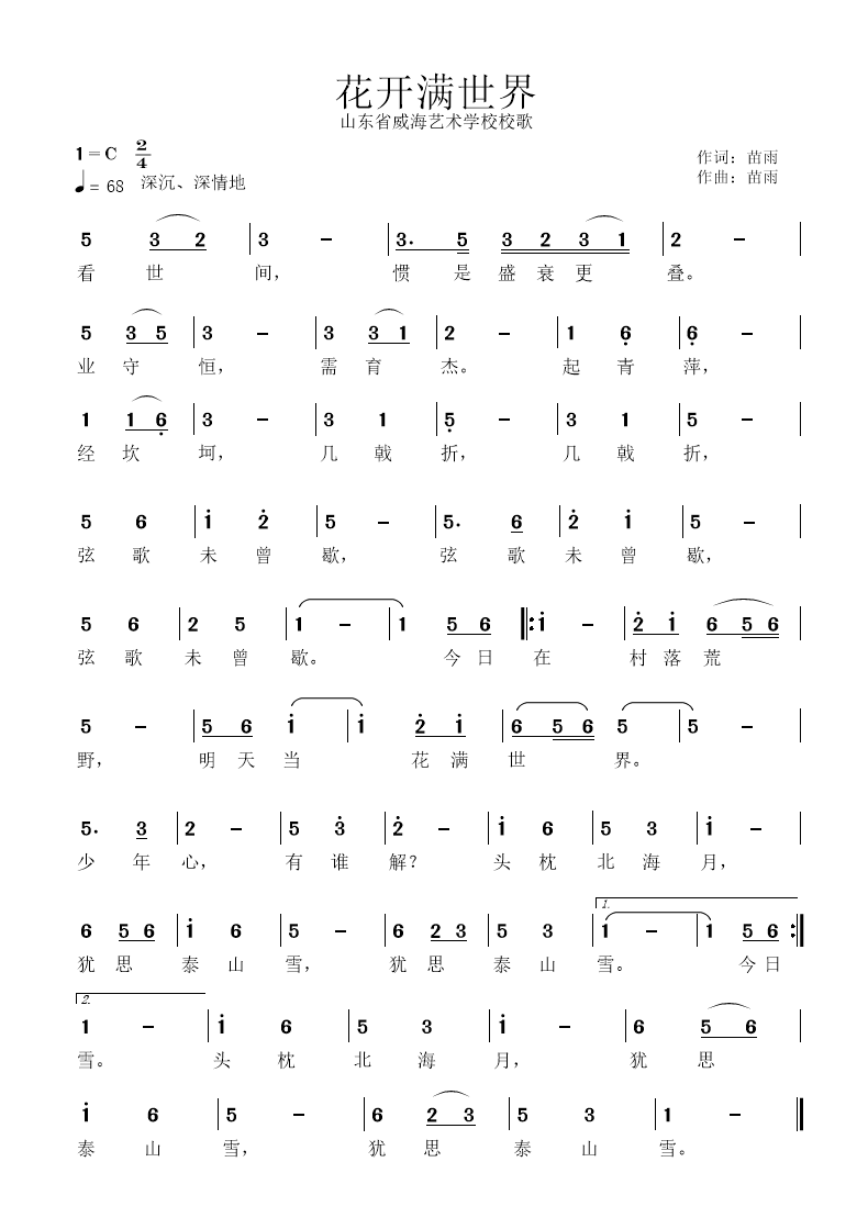 《花开满世界》 词曲皆由学校党委书记苗雨完成,历时3年。旋律采用民族调式、古曲风格,充满忧患意识和奋进精神。